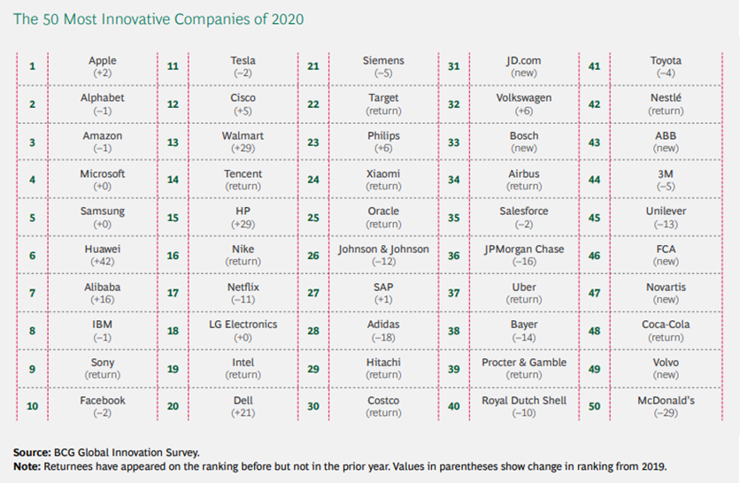 لیست نوآورترین شرکتهای دنیا در سال ۲۰۲۰ توسط گروه مشاوران بوستون و بر اساس نظرسنجی از ۲۵۰۰ مدیر نوآوری از سراسر دنیا (۶۳ درصد مدیران ارشد و ۳۷ درصد معاون یا معاون ارشد مدیران عامل) تهیه شده است. این نظرسنجی از ماه آگوست ۲۰۱۹ تا اکتبر ۲۰۱۹ به طول انجامیده است. در این تحقیق، عملکرد شرکتها در چهار بعد مختلف ارزیابی شده و با گرفتن میانگین از مجموع امتیازات هر شکت، رتبه آنها در لیست مشخص شده است. همانطور که ذکر شد در تحقیق امسال بعد جدیدی برای ارزیابی عملکرد شرکتها در نظر گرفته شده که تنوع و شدت شکستن مرزها توسط هر شرکت را به تصویر میکشد. امتیاز هر شرکت در این بخش از طریق ارزیابی توانایی شرکت در شکستن موانع ورود به صنعت و بازی در مجموعهای از بازارهای خارجی اندازهگیری میشود.